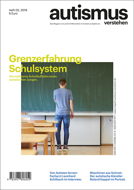 Themen in Ausgabe 02/24: Kindergarten - Wenn sich Barrieren auflösenWie ein Kindergarten allen gerecht werden möchte Schule - Lücken im System?Der Weg des 15-jährigen Elisas bis zum Schulabschluss aus Sicht der Mutter Interview: Dr. Mark BeneckeÜber Umsetzungsmöglichkeiten wissenschaftlicher Erkenntnisse zum Abbau von Barrieren in Schulen Beruf - Erwerbsminderungsrente Eine autistische Krankenschwester über Barrieren in ihrem Beruf und ihren jetzigen Möglichkeiten Studium - Rechte nutzenEine autistische Studentin über positive Erfahrungen mit dem Nachteilsausgleich beim Studium „Soziale Arbeit“ Kolumne - MaskierenGedanken einer Autistin Medizinische Versorgung - Späte DiagnoseErfahrungsbericht über den steinigen Weg bis zur Diagnose im Erwachsenenalter Sichtweisen - Autismus und AlterErfahrungsbericht Psychologie - Autistische Stärken (an)erkennenEine Autistin (freiberufliche Autismusberaterin, Ehefrau, Mutter einer autistischen Tochter, Buchautorin) aus der Innensicht Gesellschaft - Sensorische BarrierenHerausforderungen verstehen und verändern, unter anderem Möglichkeiten der deutschlandweiten Vernetzung Panorama - Helferkarten im AlltagZur Untersützung der Kommunikation - aus der Praxis für die Praxis Nachrichtenzum Thema Diskriminierung